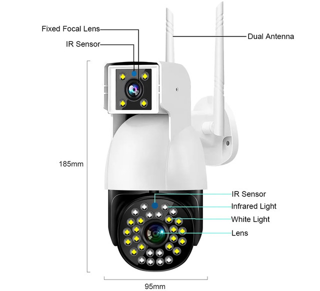 - Подвійний об'єктив із двома датчиками, подвійний екран, ширококутний перегляд + перегляд на великій відстані для забезпечення чіткого спостереження здалеку та поблизу;